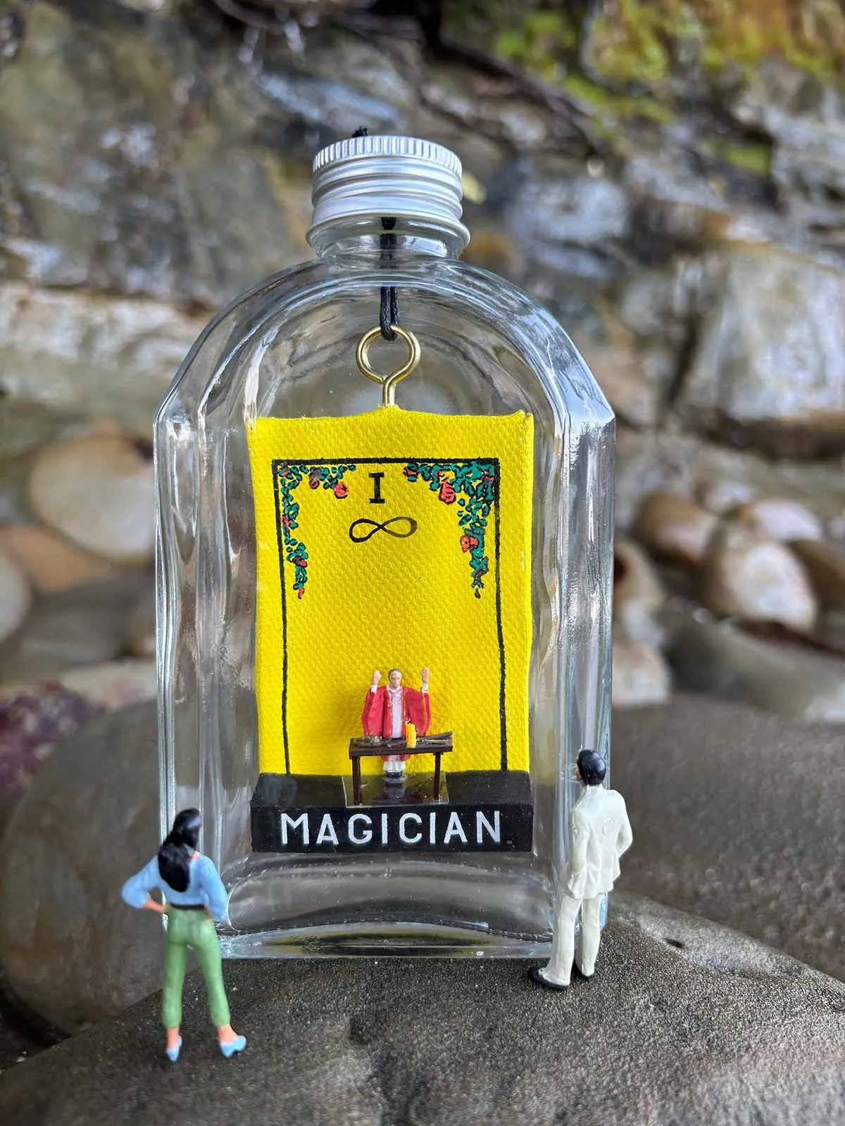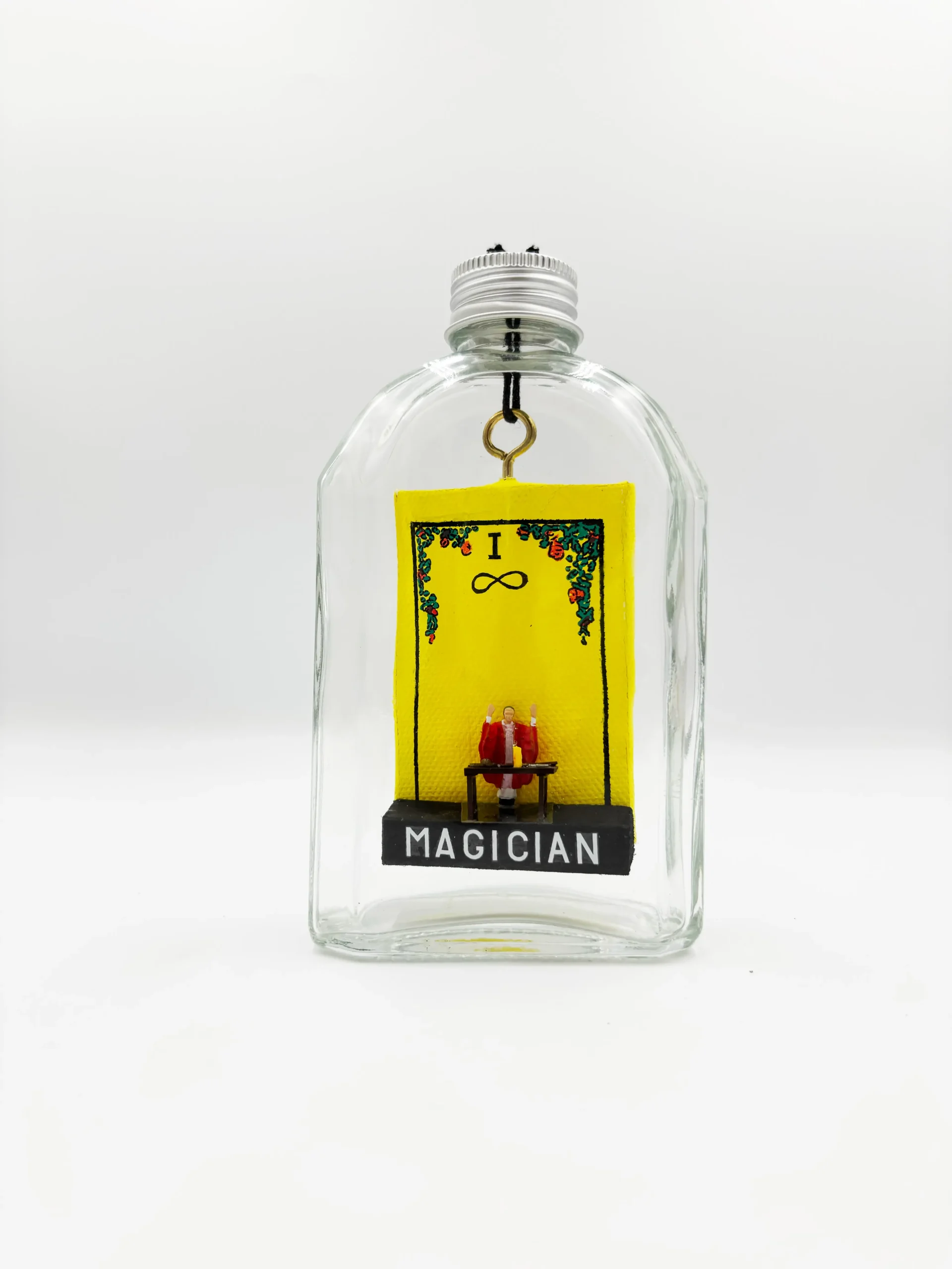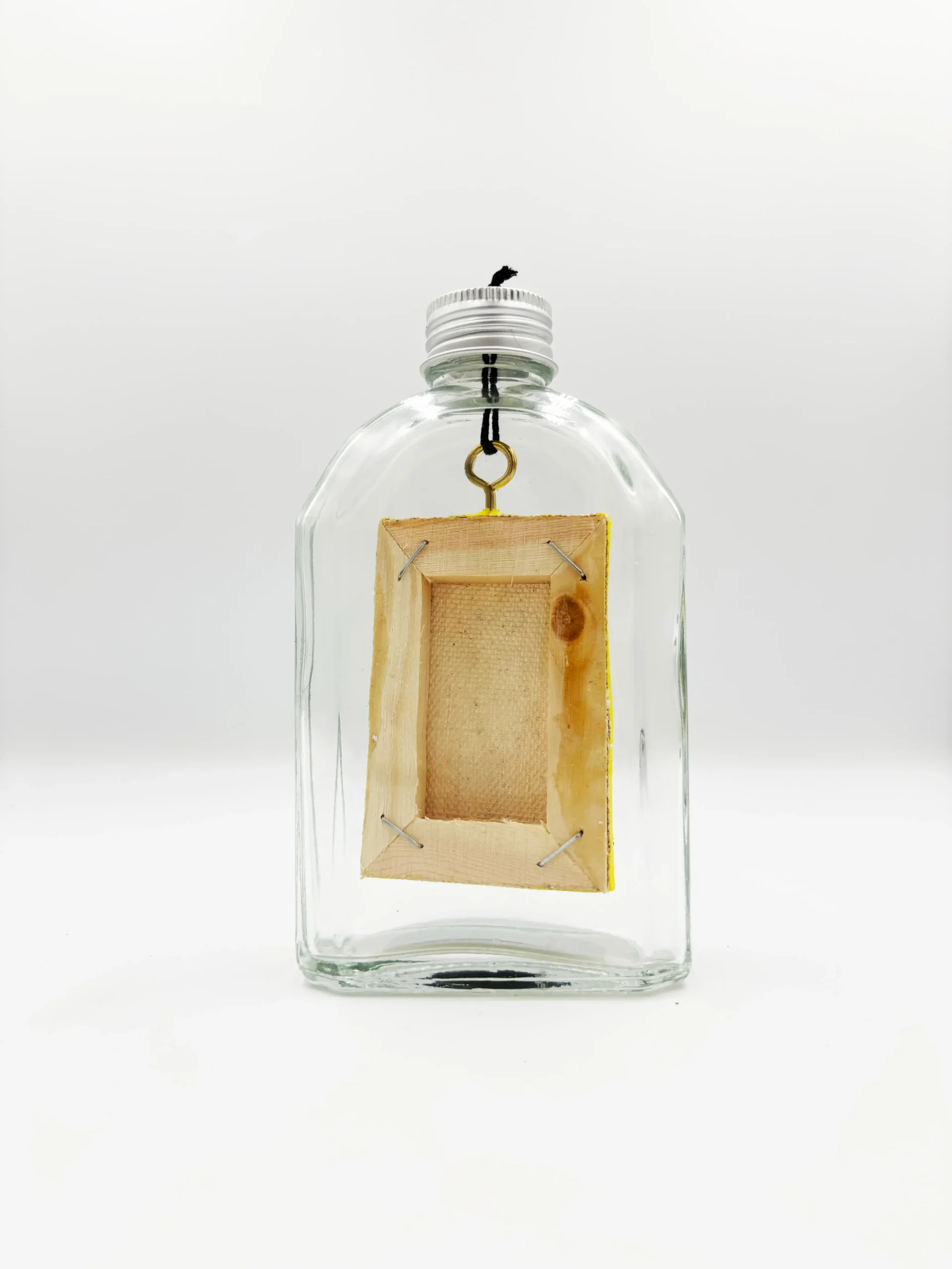 7.5cm x 5cm canvas suspended inside of an Unaltered and recycled 250ml glass bottle
